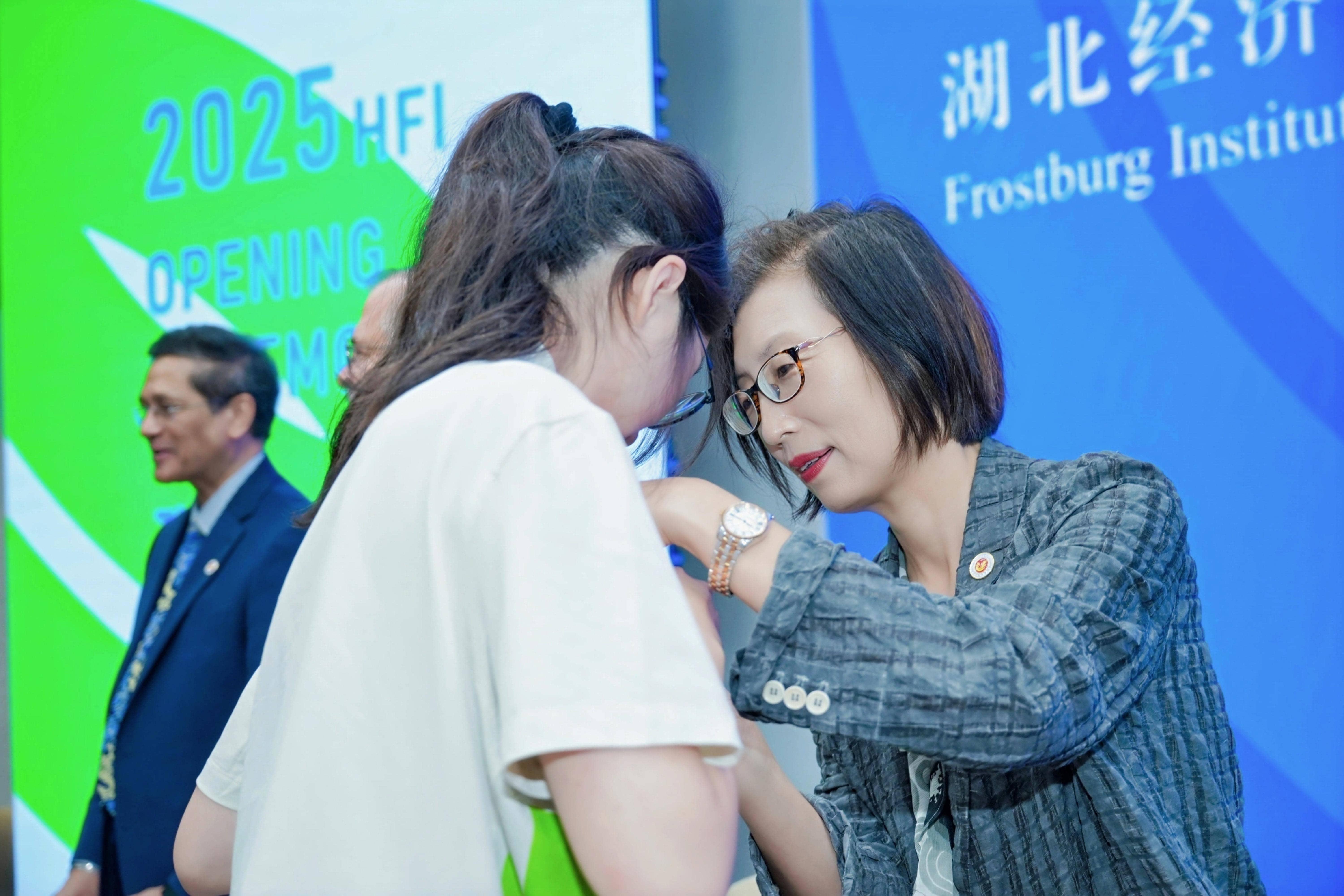 典礼第二项为授徽仪式。6名新生代表上台,由中美双方嘉宾为其佩戴湖北经济学院与美国弗罗斯特堡州立大学校徽。全体新生起立佩戴校徽,与嘉宾共同合影留念,定格这一富有历史意义的时刻。