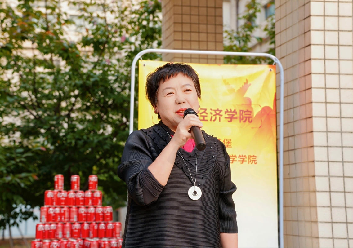 随后,湖弗学院院长何明霞教授致辞。她详细阐述了“英语浸泡村”系列活动的设计理念与丰富内涵,该活动将通过英语角、英语晨读英文电影赏析、词汇打卡等多种形式,为同学们提供一个全英文、沉浸式的学习与交流环境。何明霞院长在致辞的最后郑重宣布:“湖北经济学院弗罗斯特堡碳经济与数据科学学院‘英语浸泡村’系列活动,正式启动!”。