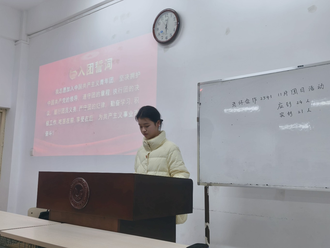 走进资环合作2541团支部,全体团员肃立,齐唱中国共青团团歌《光荣啊,中国共青团》,“我们是五月的花海,用青春拥抱时代”的嘹亮歌声,展现了新时代青年的蓬勃朝气。随后紧握右拳,重温入团誓词。“我志愿加入中国共产主义青年团……”铿锵有力的誓言回荡在会场,激励着每一位团员时刻牢记身份,恪守职责,将初心使命转化为实际行动。