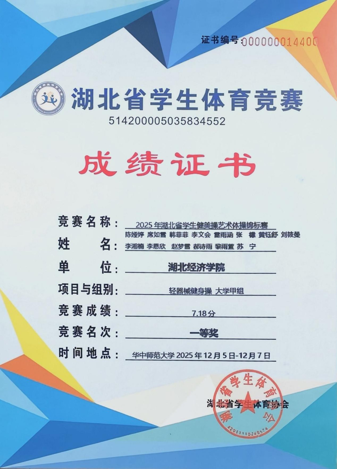 (通讯员:杨灿灿)2025年12月5日-7日,华中师范大学迎来湖北省学生健美操艺术体操锦标赛。本次赛事由湖北省学生体育协会主办,华中师范大学承办,湖北省学生体育协会健美操艺术体操专项委员会协办。此次比赛吸引来了大、中、小学共132支队伍,共计2079余人参加。湖北经济学院弗罗斯特堡碳经济与数据科学学院李湘楠、黄钰舒、刘筱曼、李恩欣四位同学所在的队伍,斩获“轻器械健美操类大学生甲组”项目第二名,荣获一等奖。指导老师是体育经济与管理学院褚媛老师和李远红老师。
